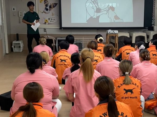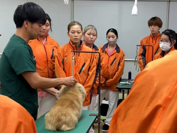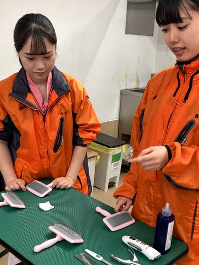 今回お届けするのは、先日第1回目のグルーミング実習が行われたばかりの動物看護・栄養管理学科の1年生たちの様子。